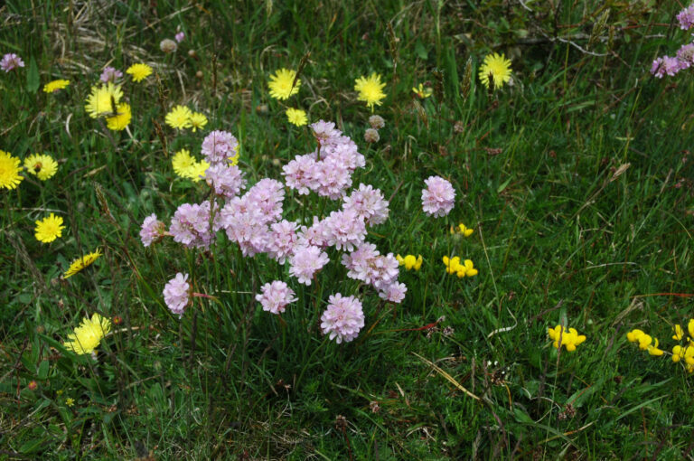 Rölleka, Strandtrift, Liten blåklocka, Rödklint, Backnejlika, Gulmåra, Gråfibbla, Flockfibbla, Blåmunkar, Gulsporre, Käringtand, Svartkämpar, Gulkämpar, Femfingerört, Bergssyra, Kärleksört, Strandglim, Harklöver och Styvmorsviol.80% gräs