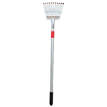 Smal och lätt räfsa i aluminium med justerbart teleskophandtag och fjäderstålspinnar.