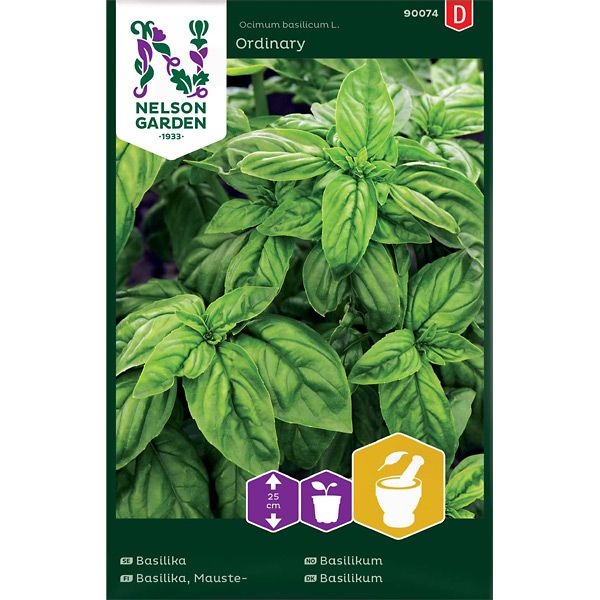 Basilika - Ordinary ger hög skörd av släta, gröna blad med stark och aromatisk doft. Använd färska blad i tomatsåser, sallader mm. Bladen går att frysa, men förlorar arom. Nyp bort hela toppen och använd bladen. Basilika är en värmeälskande växt och passar att odla i kruka i soligt och varmt läge. Kan även sås i omgångar och odlas inomhus året runt, men behöver då extrabelysning vintertid. Trivs i näringsrik, väldränerad jord. Ge näring regelbundet. Bör förodlas för utplantering när lägsta nattemperatur är 15C. Så glest i fuktig såjord. Ställ i rumstemp. Omplantera 3-4 plantor/kruka i gödslad jord. Använd extrabelysning vid tidig sådd.