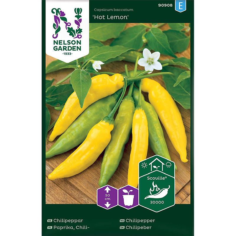 Spännande sort med doft och smak av citrus! Får ca 4cm långa, gula frukter med stark hetta. Ypperlig till heta räkrätter. Avlägsna de heta fröna innan förtäring, använd kniv, tvätta händerna ordentligt direkt efteråt. Bra i kruka på altan, balkong eller i växthus. Gödsla och vattna regelbundet.