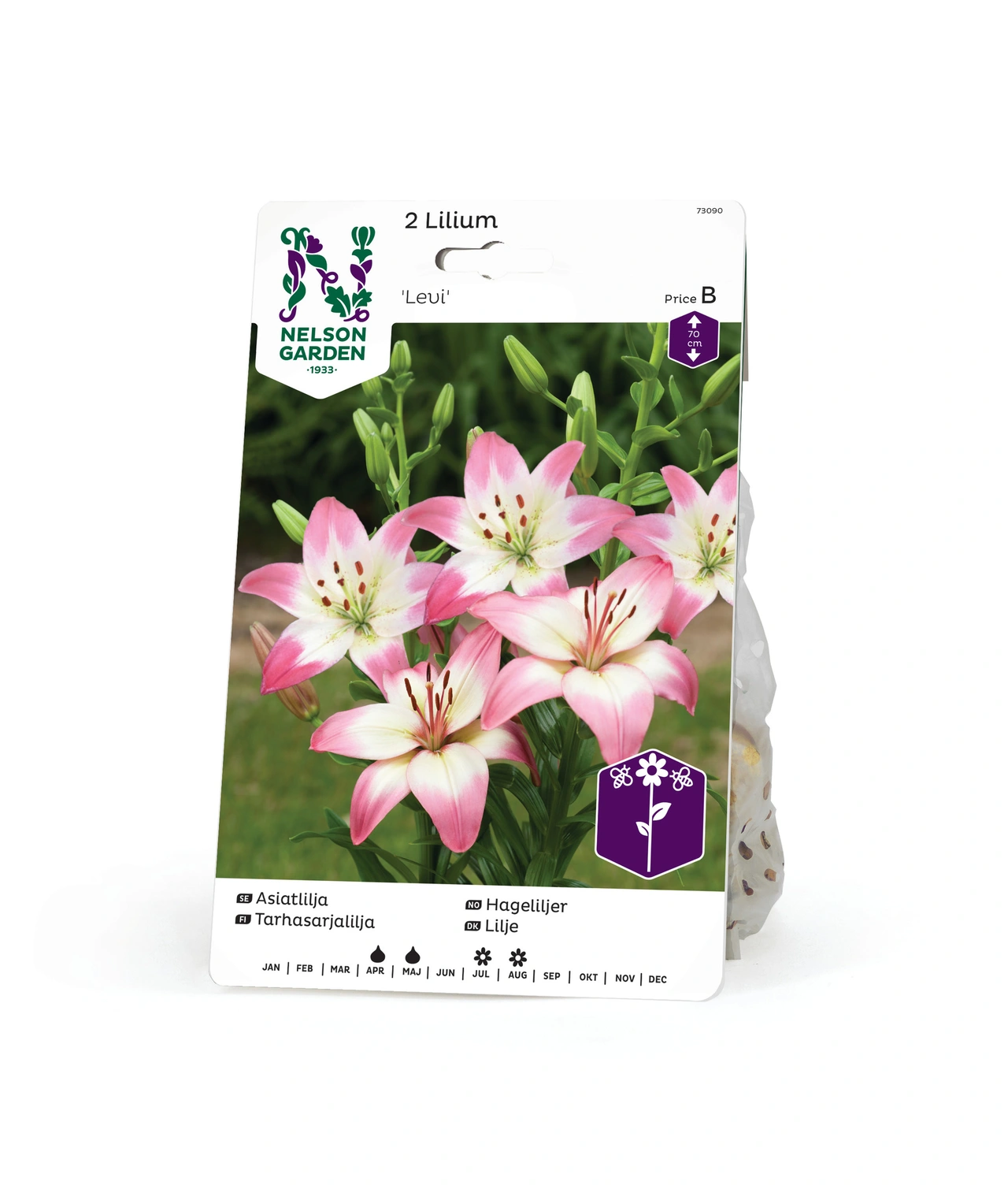 Medelhög asiatisk lilja med polkagrisfärgade, eleganta blommor. Passar bra i blandade rabatter och till snitt. Plantera gärna tre eller fler i grupp. Eller varför inte i kruka på uteplatsen?