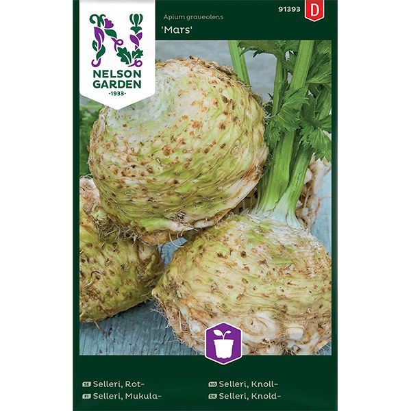 Rotselleri, mars är en delikat rotfrukt som får stora, runda, jämna rötter. Bladverket är mörkgrönt och upprätt, vilket gör det mer motståndskraftigt mot sjukdomar. Lättodlad, men tar lång tid. Går bra att lagra, men kan också förvällas och frysas. Tål kyla på hösten men ej på våren, sätt inte ut plantorna för tidigt. Rotselleri - Mars trivs i mullrik jord, gärna kalkhaltig. Gödsla och vattna rikligt. Täck med fiberduk för snabbare skörd.