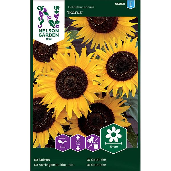 Solros - Ikarus är en härlig solros som grenar sig från basen och blommar rikligt med 12-15cm stora solgula blommor med mörk mitt. Kan användas i rabatt, som avskärmning, planteras mot husvägg eller mur. Passar utmärkt till snitt. Trivs i näringsrik jord men är anspråkslös. Spara gärna fröställningarna till småfåglarna.
