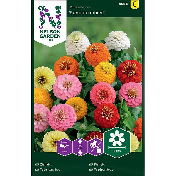 Zinnia - Sunbow Mixed är en trevlig sommarblomma med lång blomningstid och blommor i massor av färger. Den har styv, upprätt stjälk med en eller flera välformade fyllda blommor i toppen. Skär man av kvistar, grenar sig plantan. Färgstarkt inslag i rabatter och krukor. Hållbar snittblomma. Trivs i välgödslad, lucker jord. Vattna vid torka.